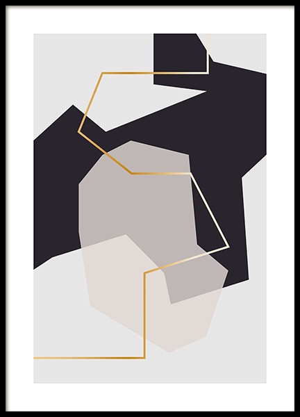 Handpicked design Ilustración de diseño gráfico con figuras abstractas en gris, beis y negro con un marco dorado (no es pan de oro) y delgado en forma de rectángulo en medio de la imagen. Este motivo lucirá de lo mejor solo o acompañado en una pared de cuadros grande. Puedes combinarlo con Abstract Fragments No2 si deseas colgar una pareja de cuadros haciendo juego.
