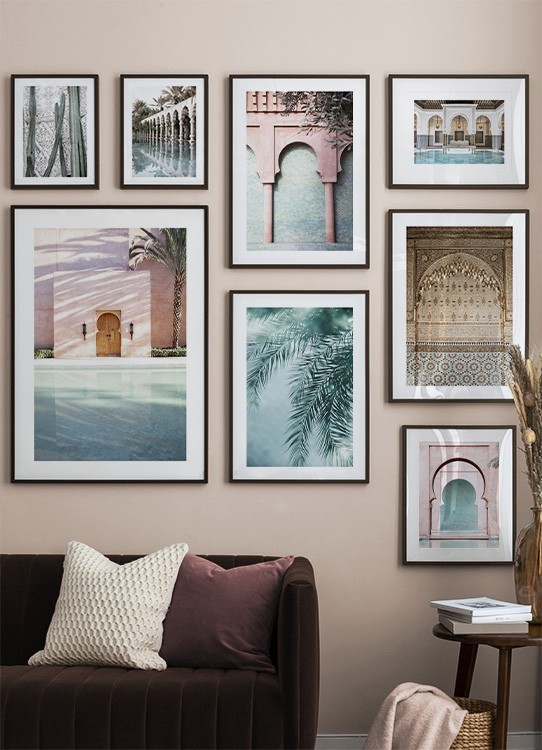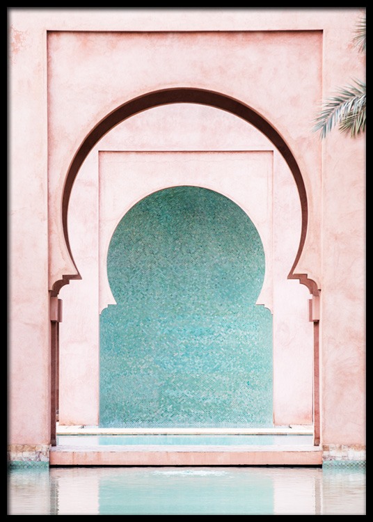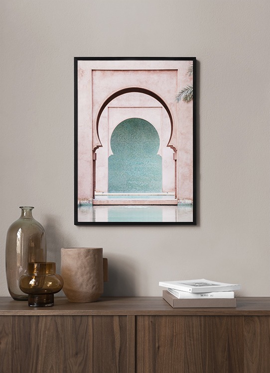 Handpicked design Fotografía de una pared azul al fondo, y paredes con arcos rosas al frente del motivo. Nos encanta la arquitectura en tonos pastel. ¡Nunca pasa de moda! Se trata de un diseño que pone en evidencia la belleza y el misterio de Marrakech y los ricos detalles de su antigua arquitectura. Este póster forma parte de la colección exclusiva Studio Amara, una serie de fotografías realizadas en Marrakech por Desenio Design Studio.