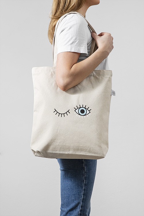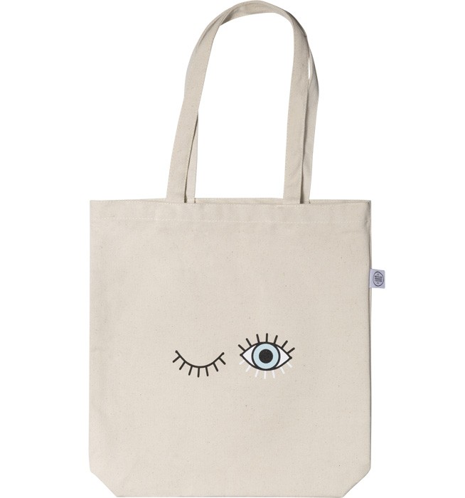 – Tote bag color beis con un motivo estampado en negro. El dibujo tiene un ojo cerrado y un ojo abierto