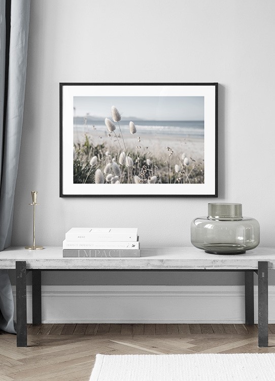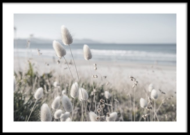 Handpicked design Fotografía de gramínea con flores blancas en una duna con playa y mar de fondo. Se trata de una imagen tipo de ensueño que lucirá perfectamente en salones o dormitorios, según el estilismo que desees crear.