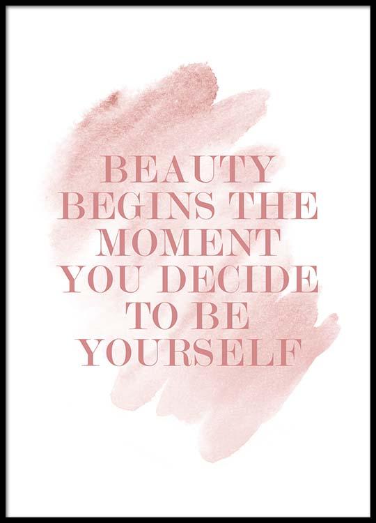 Handpicked design Póster blanco con una frase escrita en rosa y unos brochazos de acuarela color rosa detrás; "Beauty begins the moment you decide to be yourself". Este poster se empareja bien con motivos que tengan que ver con el mundo de la moda; así conseguirás una pared de cuadros armónica. Llena tu hogar con arte que te inspire para llevar siempre la cabeza en alto.