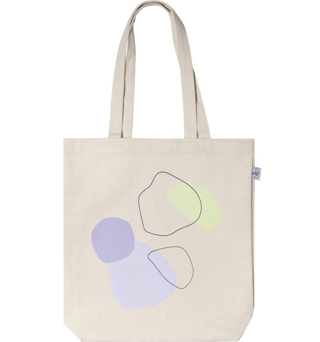 – Tote bag color beis con estampado de figuras abstractas en violeta y verde