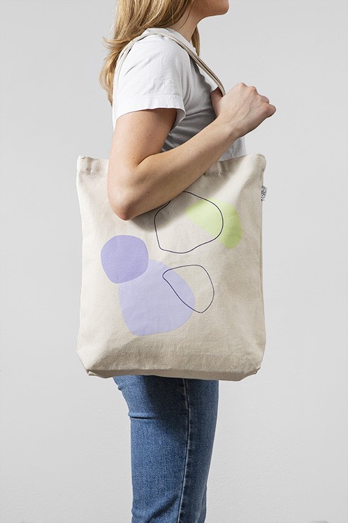 Handpicked design "Bolso beis con estampado de figuras abstractas en violeta y verde. Salir de compras será mucho más divertido con un bolso tan a la moda