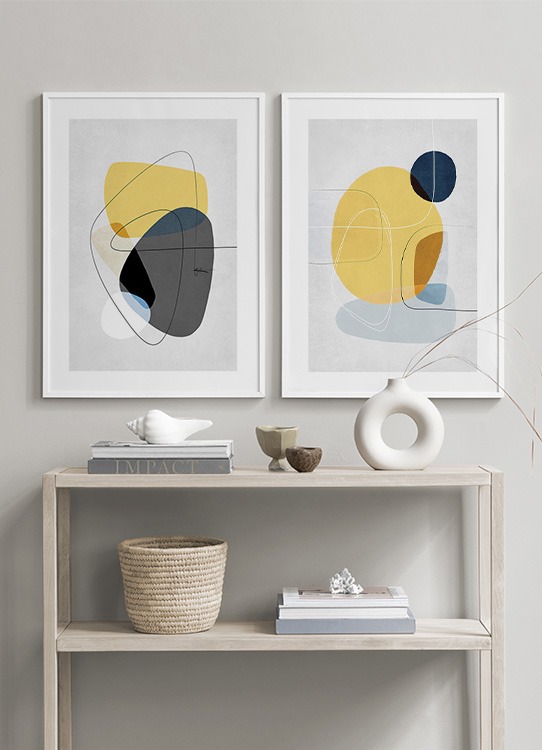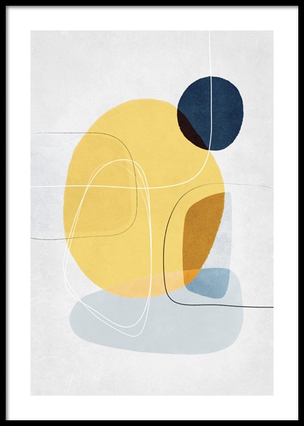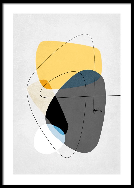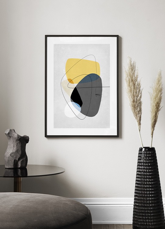 Handpicked design Ilustración de diseño gráfico con fondo gris claro, círculos en amarillo y gris oscuro y un garabato de trazo delgado y negro. Acompaña este motivo con Contemporary Yellow No1 y conseguirás una hermosa pareja.