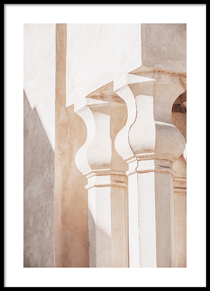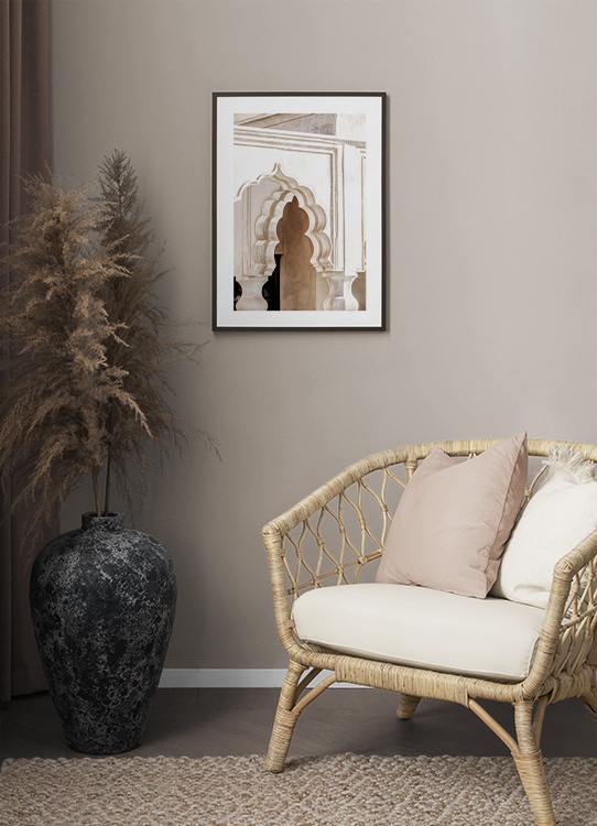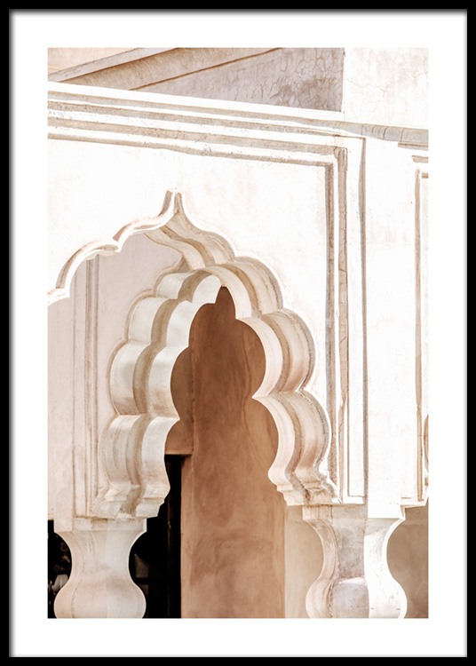 Handpicked design Fotografía de un edificio beis con un arco marroquí. La ciudad de Marrakech es famosa por su bella arquitectura antigua en tonos brillantes y con detalles en dorado. Esta colección captura sin ninguna duda toda la belleza que este destino tiene para ofrecernos. Este póster forma parte de la colección exclusiva Studio Amara, una serie de fotografías realizadas en Marrakech por Desenio Design Studio.