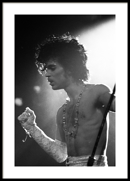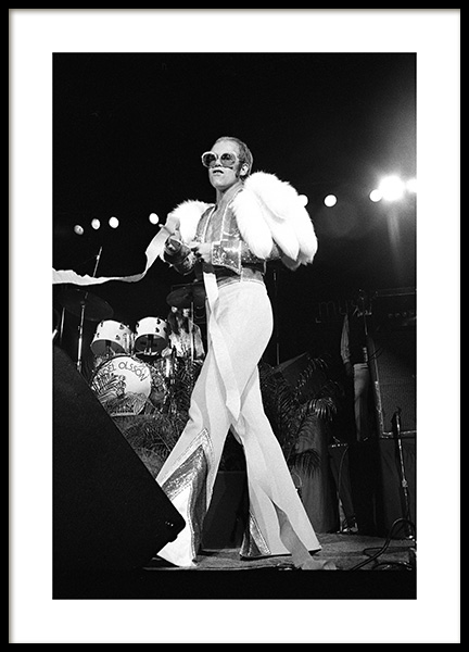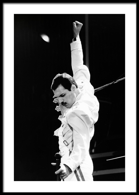 Handpicked design Fotografía en blanco y negro con la imagen de un ícono; Freddie Mercury del grupo Queen. El artista está vestido de blanco, tiene un micrófono en una mano y la otra en alto. Seguramente tienes algún ídolo. Visita la categoría Íconos donde podrás encontrar fotografías de personajes famosos donde posiblemente esté la personalidad que más te gusta.