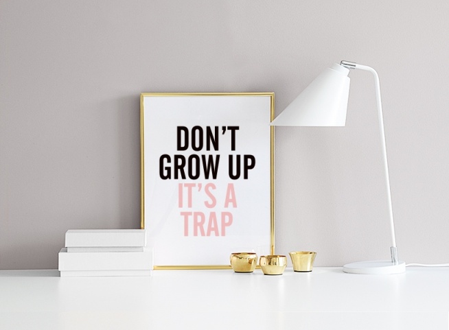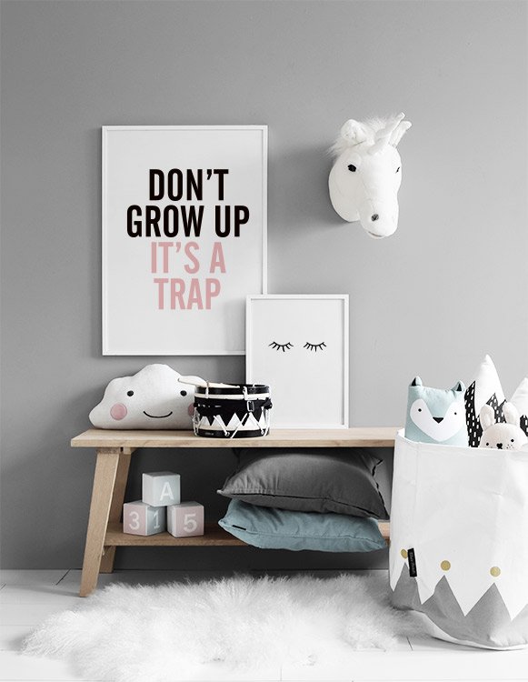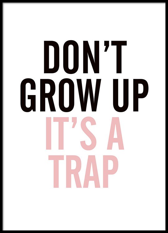 Desde 5,57 €Cuadros con texto con bonitos mensajes. Un divertido póster con el texto 'Don't grow up it's a trap', en negro y rosa. Un texto en el que quizás todos nos veamos identificados. ¡Queda perfecto en la habitación de los niños! Puedes combinar más pósters en una decoración de pared o en un collage. Encuentra tus favoritos en nuestras categorías.