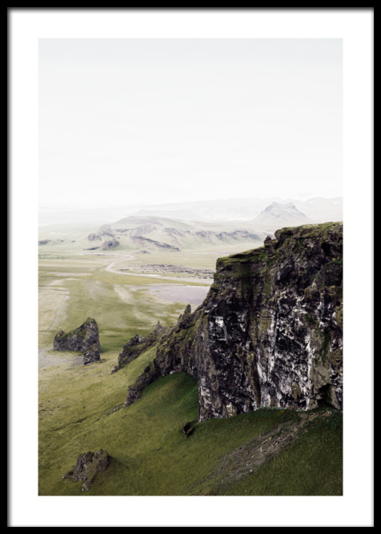 La imagen tiene un borde en blanco que encuadra delicadamente la foto.Fotografía de montañas rocosas en un paisaje verdoso en Islandia. Tranquiliza tu alma con láminas de motivos naturales que decorarán tu pared de cuadros. Explora la colección exclusiva de imágenes de flora y fauna realizada en Islandia por Studio Elements by Desenio Design Studio.