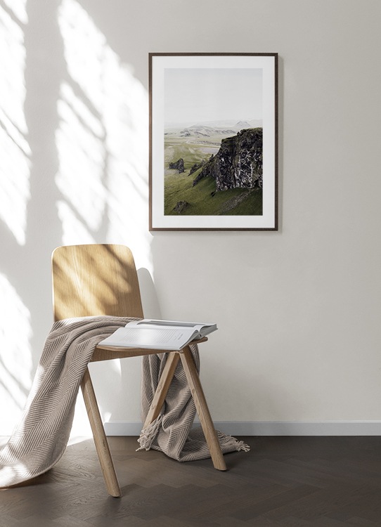 Handpicked design Fotografía de montañas rocosas en un paisaje verdoso en Islandia. Tranquiliza tu alma con láminas de motivos naturales que decorarán tu pared de cuadros. Explora la colección exclusiva de imágenes de flora y fauna realizada en Islandia por Studio Elements by Desenio Design Studio.