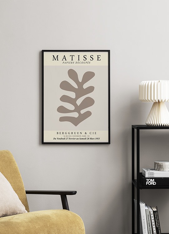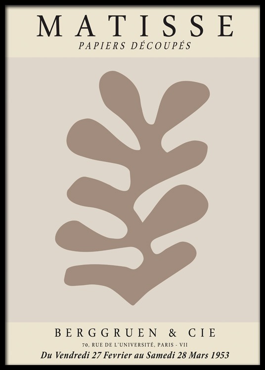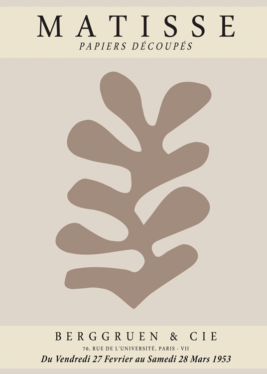 Handpicked design Ilustración de diseño gráfico. Este motivo tiene fondo beis, una hoja color marrón y el siguiente texto en el extremo superior e inferior de la imagen: “Matisse Papiers Découpés”. ¡Con estos pósters artísticos tu casa parecerá una galería de arte! Encuentra motivos a juego en la categoría Arte y Diseño Gráfico.