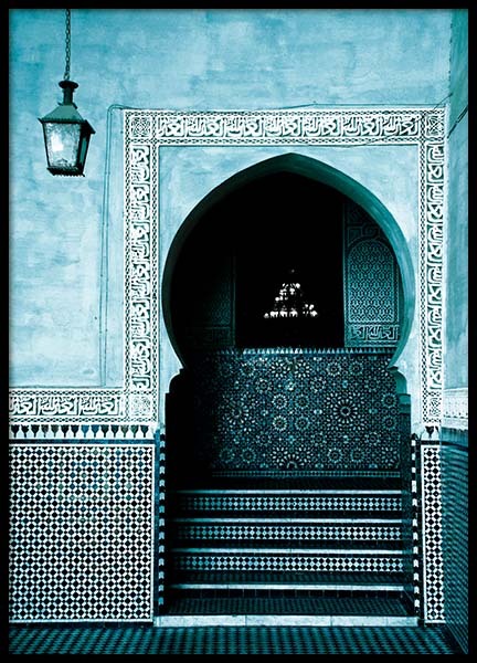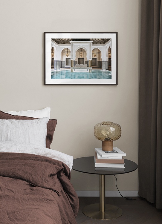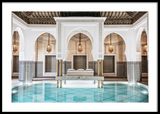 Handpicked design Fotografía de una piscina en una estancia con lámparas doradas, y columnas y arcos azules y blancas. Se trata de un lugar secreto lleno de tradición y arte con el que iniciarás un romance eterno. Este póster forma parte de la colección exclusiva Studio Amara, una serie de fotografías realizadas en Marrakech por Desenio Design Studio.
