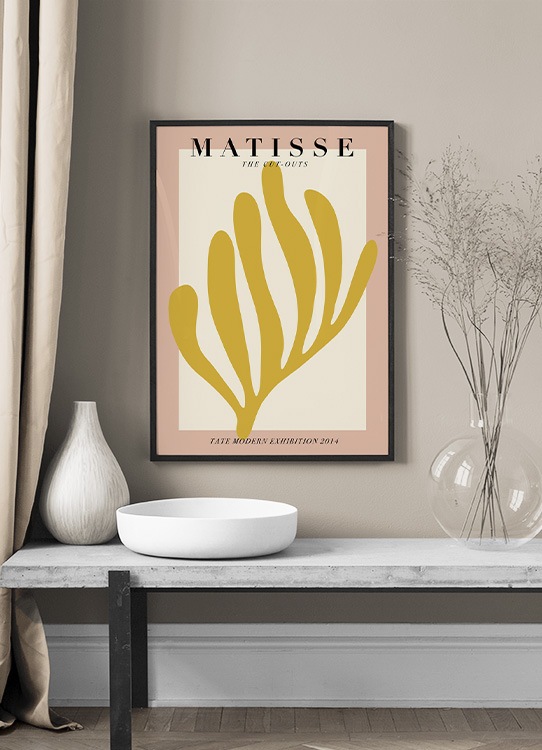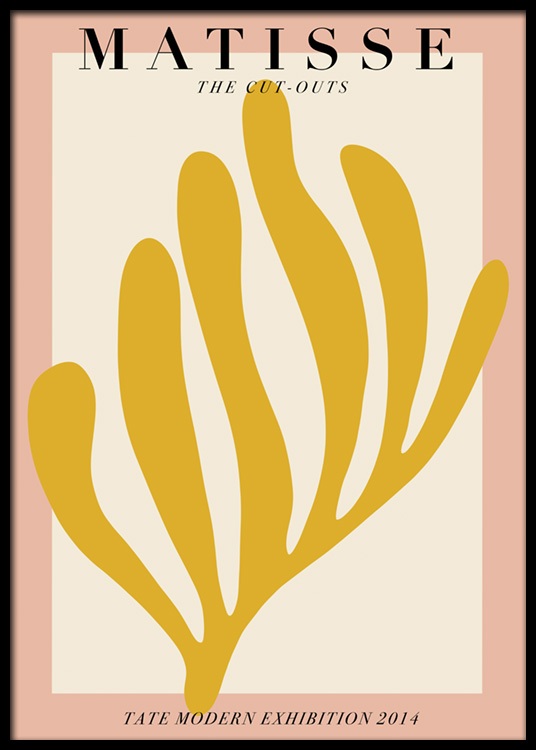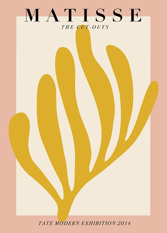 Handpicked design Ilustración de diseño gráfico con una figura amarilla en forma de coral sobre un fondo beis enmarcado en color rosa. El póster dice “Matisse The Cut-outs” en el borde inferior del motivo. Se trata de un estilo que encajará perfectamente en un interiorismo moderno caracterizado por el arte gráfico y abstracto. ¡Acompáñalo con Matisse Papiers y tendrás una bonita combinación de cuadros!