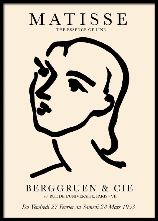 Handpicked design Ilustración en arte de línea con fondo beis y un rostro de contornos gruesos. El póster dice “Matisse The Essence of Line” en la parte superior del motivo y lleva texto en la parte inferior también. Matisse ha sido fuente de inspiración para muchos artistas. Se trata de un diseño clásico que no pasará nunca de moda.