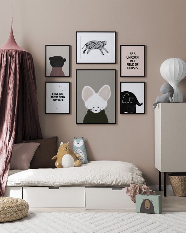 Y como los niños crecen y sus intereses también cambian a medida que lo hacen, para evitarte tener que estar trabajando todo el rato, un consejo es utilizar cinta de washi o clips para pósters para los cuadros infantiles, ya que así no tendrá ningún agujero ni marca en las paredes cuando decida cambiar los pósters o los cuadros. ¡Deja volar tu fantasía cuando decores la habitación de los niños! Si quieres comprar alguna de nuestras combinaciones de cuadros para la habitación de los niños, no tienes más que hacer clic en la imagen o visitar nuestra categoría Cuadros infantiles, donde podrás echar un vistazo a todos nuestros motivos.