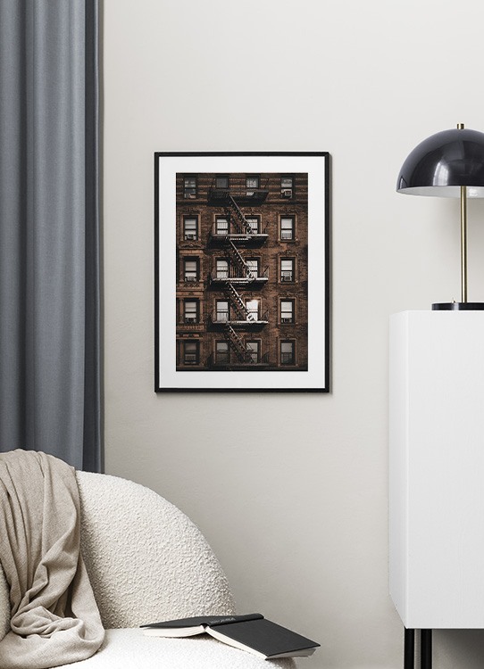 Handpicked design Fotografía de la salida de emergencia en la fachada de un edificio marrón. Si no puedes escaparte a Nueva York, ¡tráela a tu casa! Siente el pulso de esta ciudad con los pósters que decoran tus paredes.