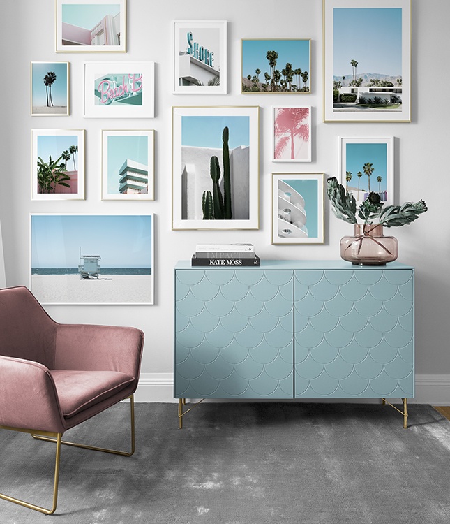 Handpicked design Nada más aterrizar en Palm Springs sentimos la calma. Rodeado de majestuosas palmeras, una arquitectura elegante y bonitos toques coloridos, por todos los sitios hay motivos de póster que quedan perfectos. ¿Qué podría ser más fotografiable que palmeras delante de una fachada en todos los colores del arco iris? El póster tiene un borde blanco que enmarca el motivo de manera muy bonita.