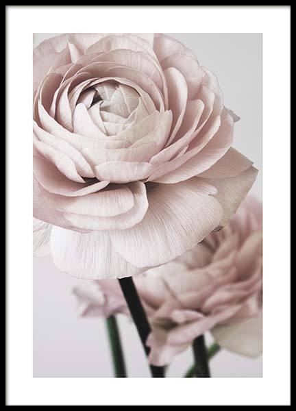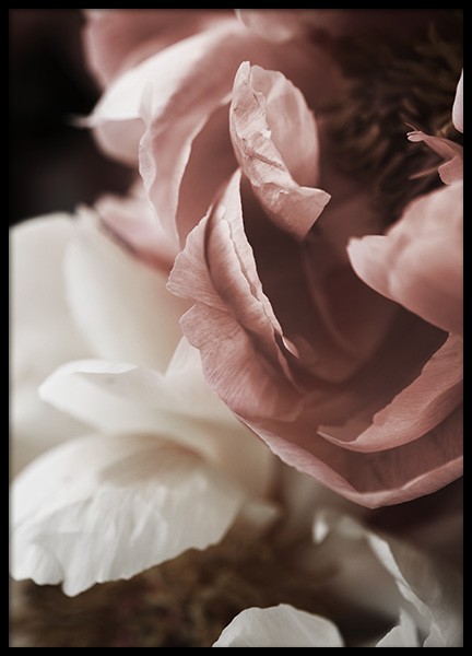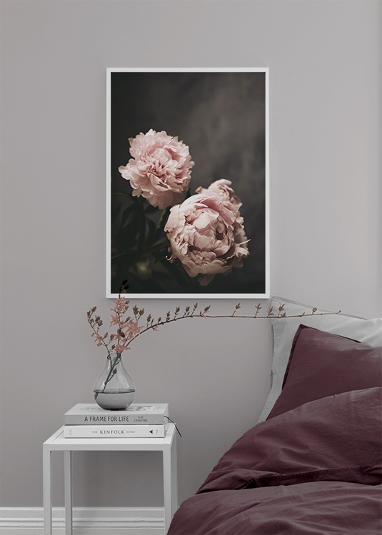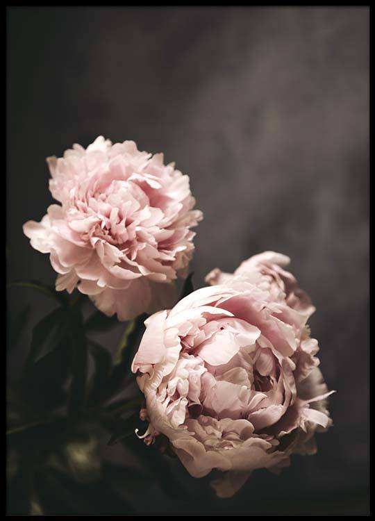 Handpicked design Fotografía de dos peonías grandes color rosa, fondo gris oscuro. Los pósters con motivos de botánica son un agregado significativo en un interiorismo que busca crear un espacio cálido y acogedor. Si añades algunos detalles de influencia botánica le estarás dando nueva vida a la estancia e infundirás un estilo que llama a la introspección. Los tonos suaves de rosa le dan al póster un aspecto muy delicado.