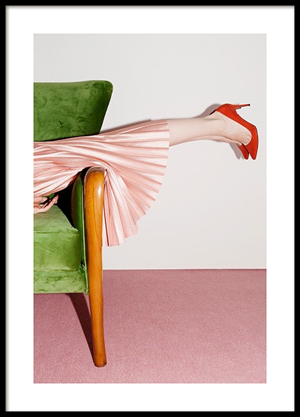 Handpicked design Fotografía de una mujer con medias rojas, falda verde y tacones negros, aparentemente cabeza abajo.