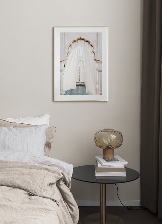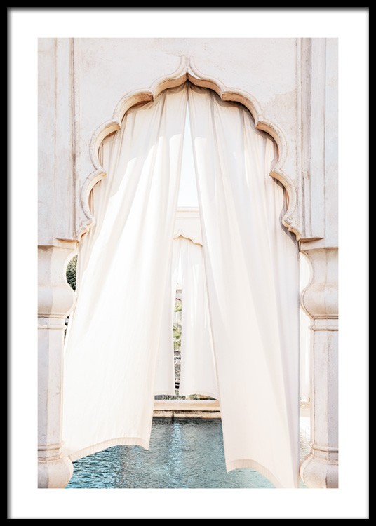 Handpicked design Fotografía de una cortina blanca en una puerta con arco marroquí en primer plano y una piscina detrás. Este motivo tiene azulejos coloridos, arcos y una arquitectura de lo más bella; Marrakech es un lugar verdaderamente mágico. Este póster forma parte de la colección exclusiva Studio Amara, una serie de fotografías realizadas en Marrakech por Desenio Design Studio.