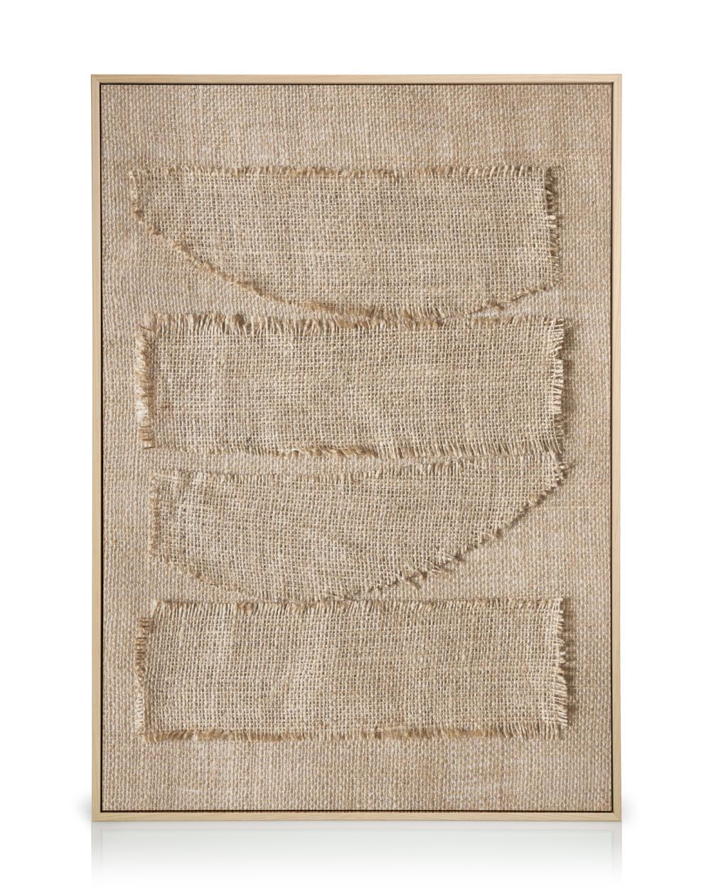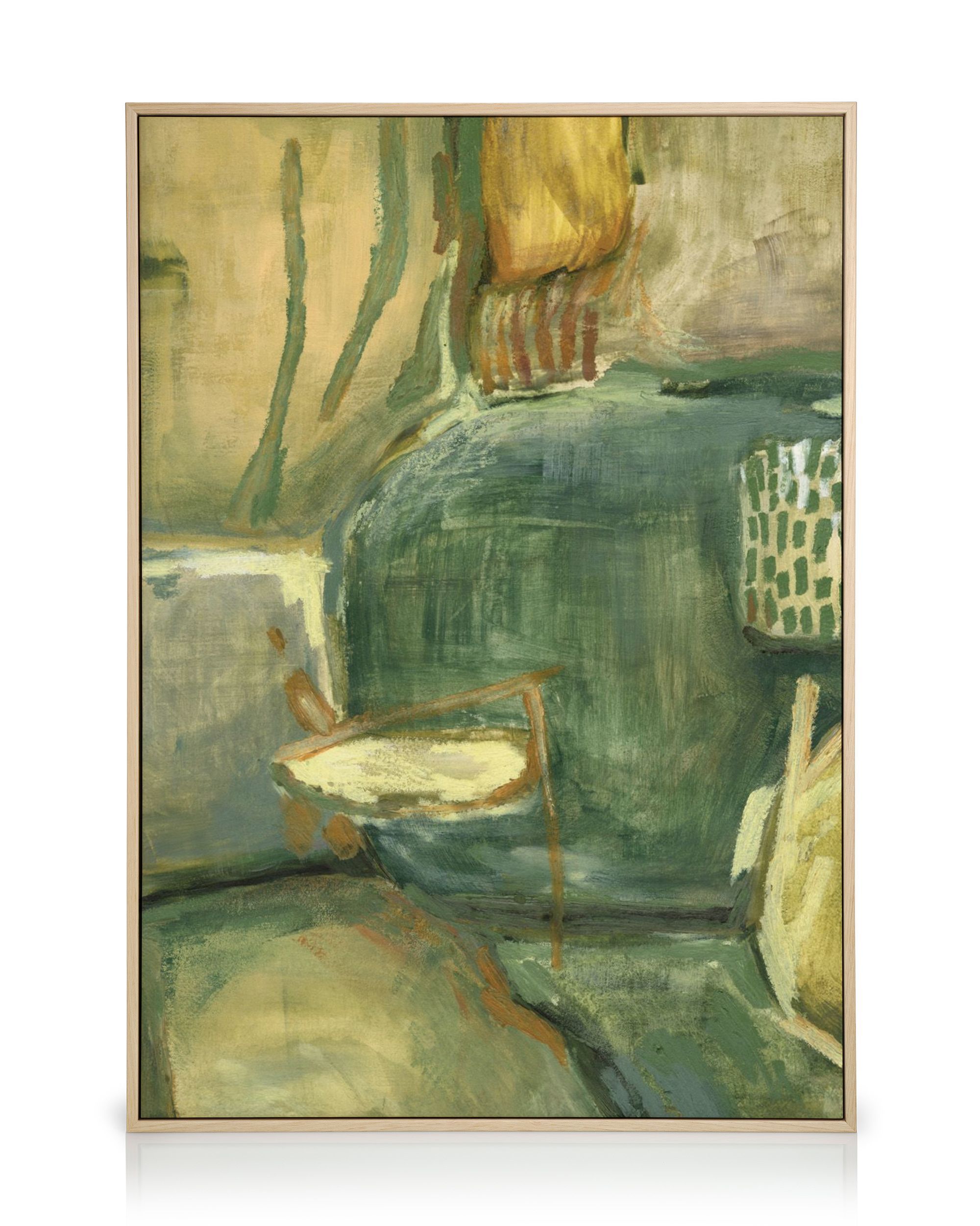 Un mural de cuadros con dos lienzos. El lienzo de la izquierda presenta una pintura abstracta en verde, amarillo y marrón. El lienzo de la derecha muestra un diseño texturizado en beige.