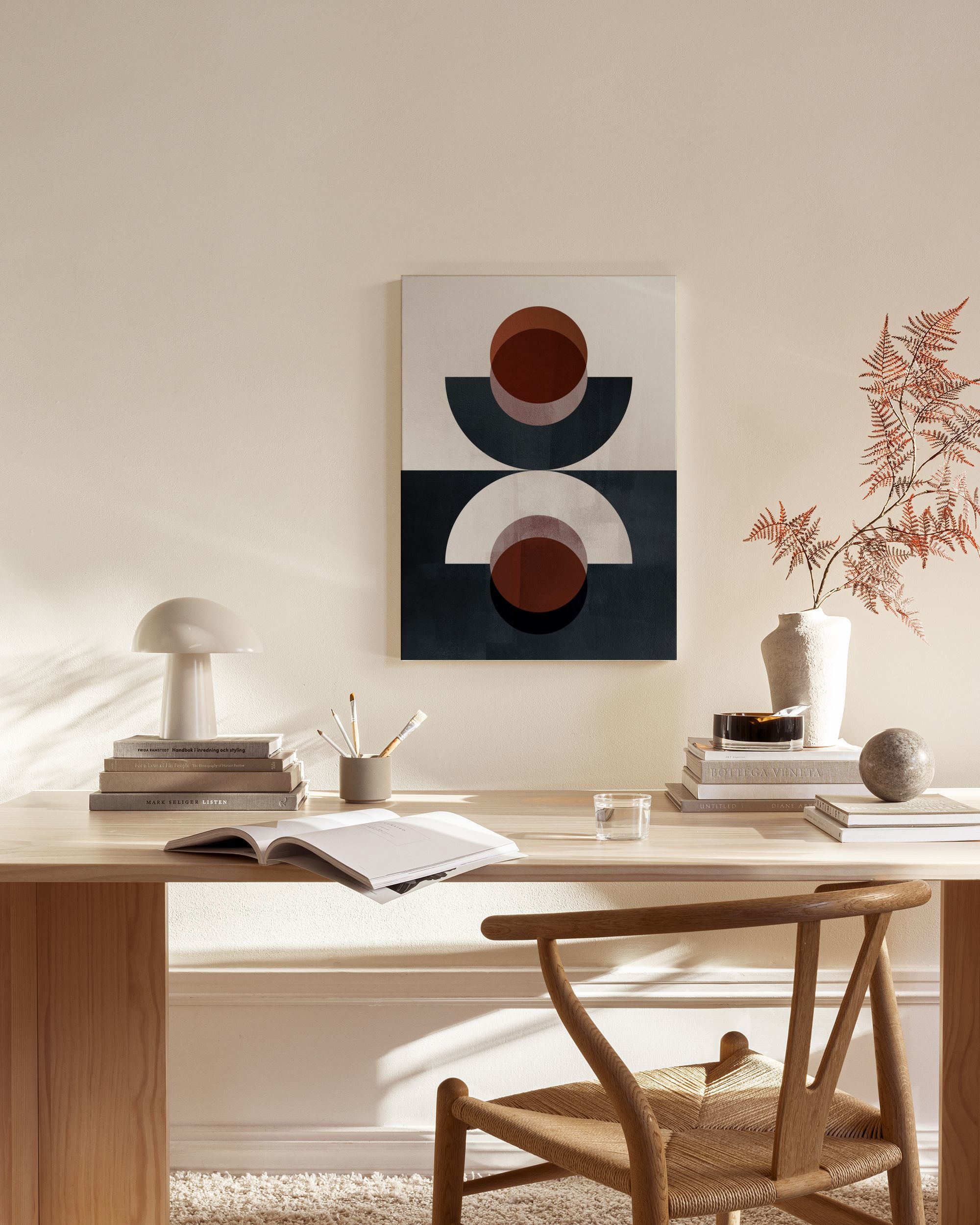 Desde 28,54 €Lienzo abstracto geométrico con dos secciones, cada una con un semicírculo y un círculo. Tonos beige, gris y marrón en la parte superior, con un esquema de colores negro, blanco y marrón oscuro en la parte inferior.