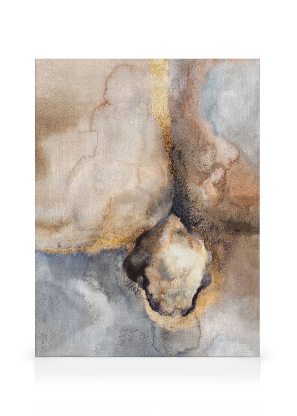 Un lienzo abstracto con formas difuminadas en tonos marrón, beige, gris y azul, y una línea vertical dorada. La textura de acuarela le da un aspecto suave sobre el fondo blanco.