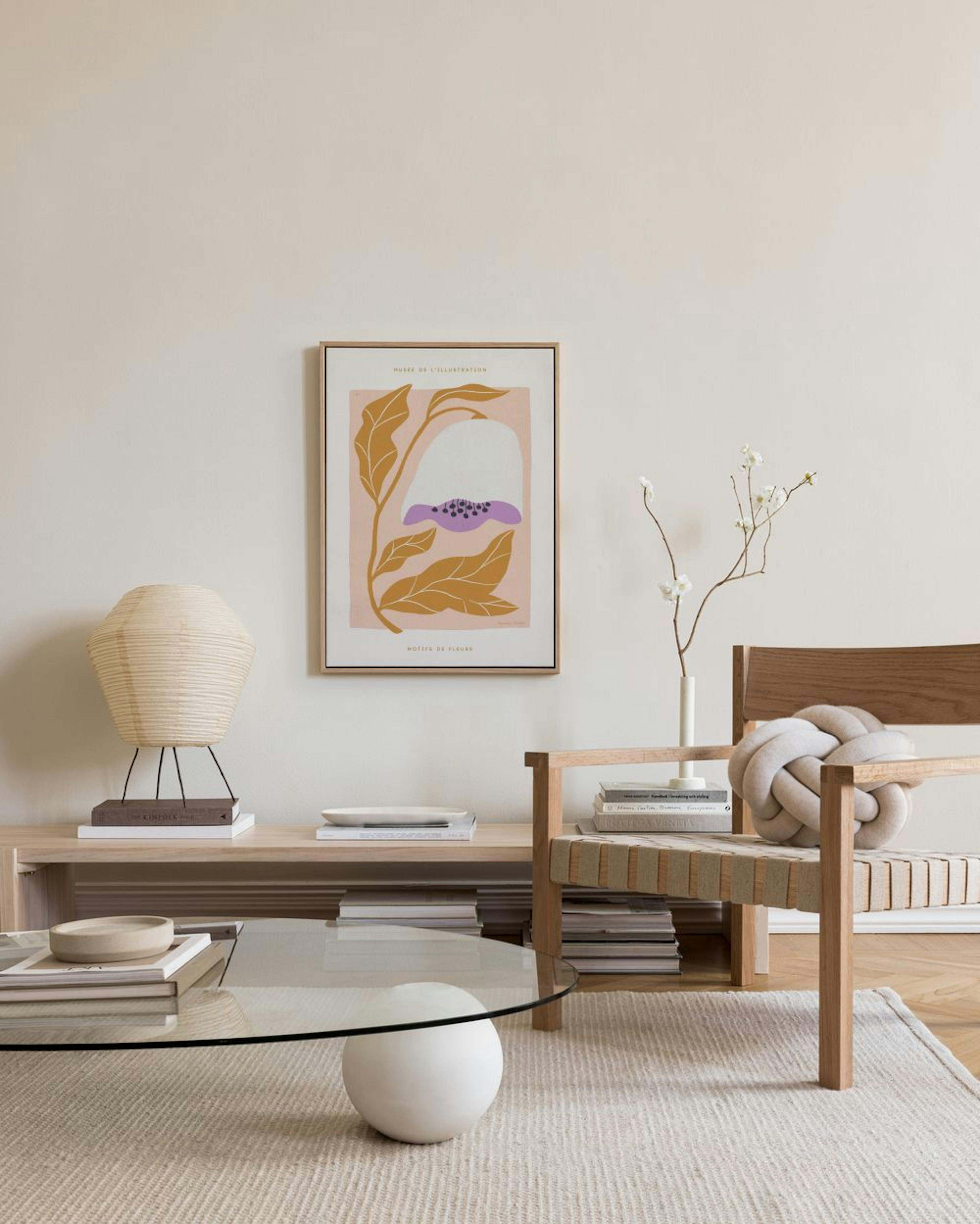 Un cuadro floral estilizado en lienzo, mostrando hojas doradas contra un arco blanco y una forma púrpura con puntos negros. Arte mural que añade elegancia a su hogar.