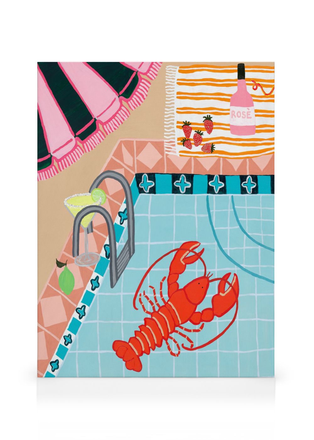 Desde 24,95 €Lienzo colorido de una escena veraniega de piscina con una sombrilla rosa, una toalla, un cóctel, fresas y una langosta roja en agua azul brillante.