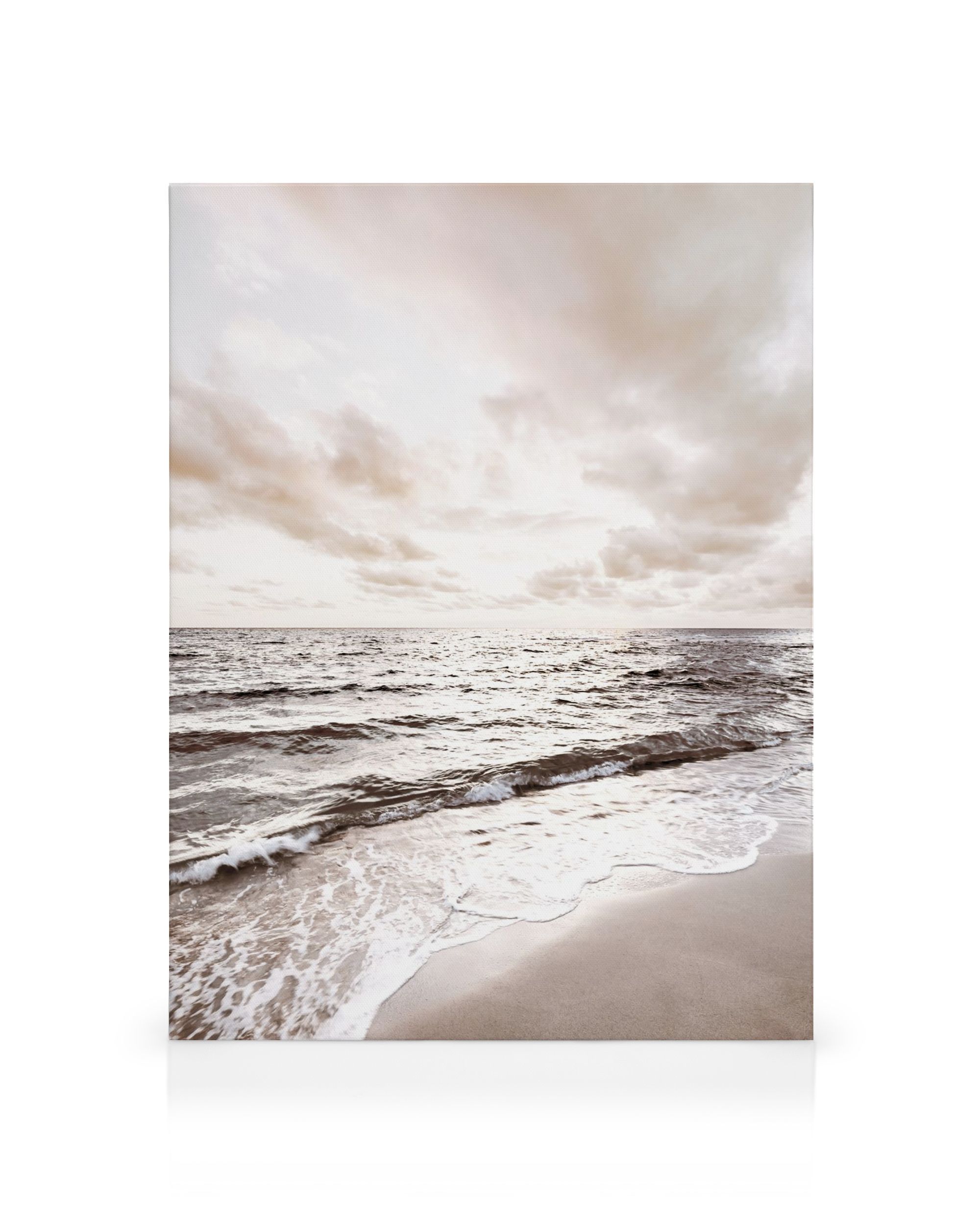 Un lienzo calmante de un paisaje de playa, con olas acariciando suavemente la orilla arenosa. Azules serenos y marrones suaves crean una escena pacífica, perfecta como arte mural para su hogar.