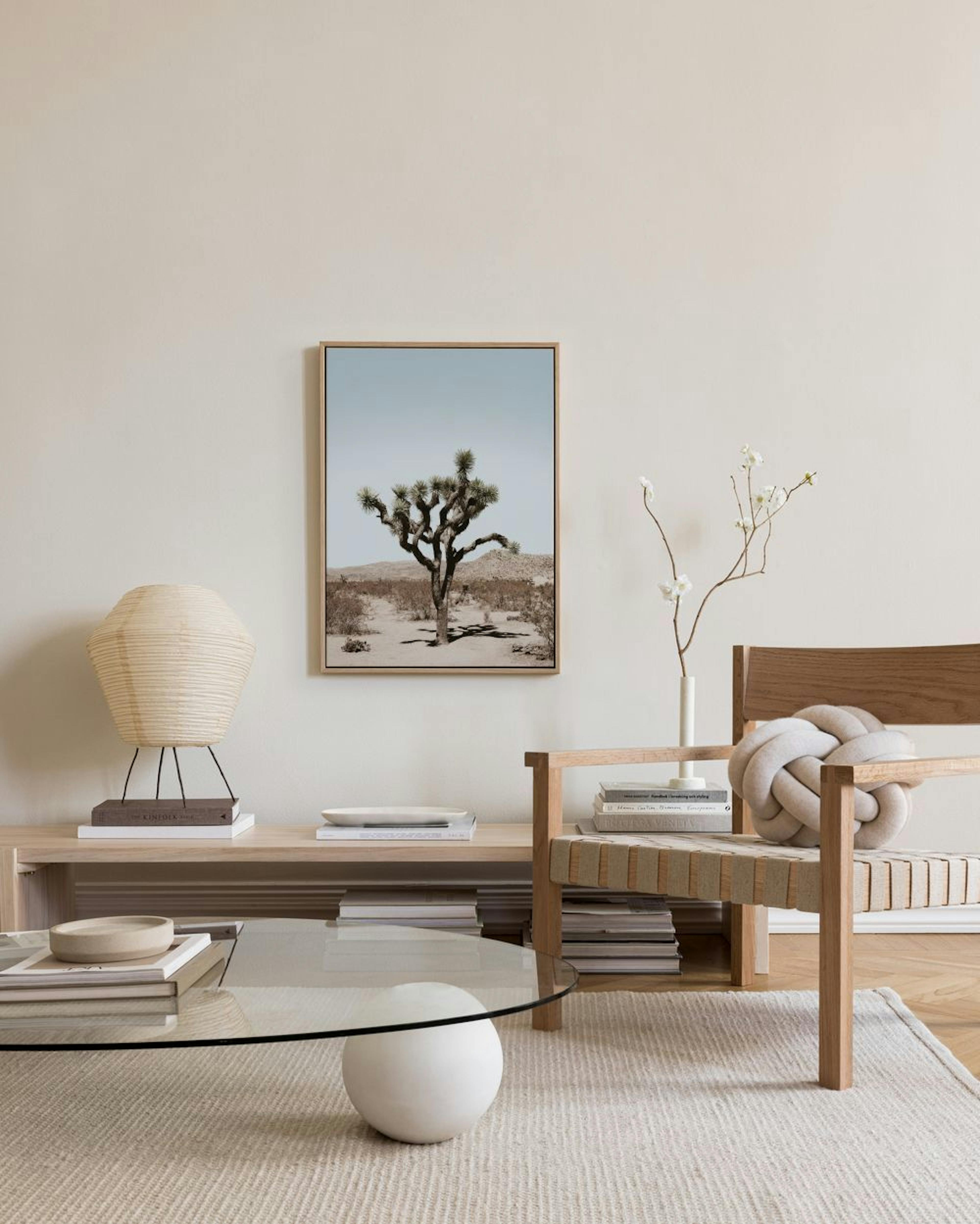 Impresionante lienzo de un árbol de Joshua en un paisaje desértico escaso. El tronco retorcido del árbol y sus hojas puntiagudas destacan contra las colinas arenosas marrones y bronceadas bajo un cielo azul claro.