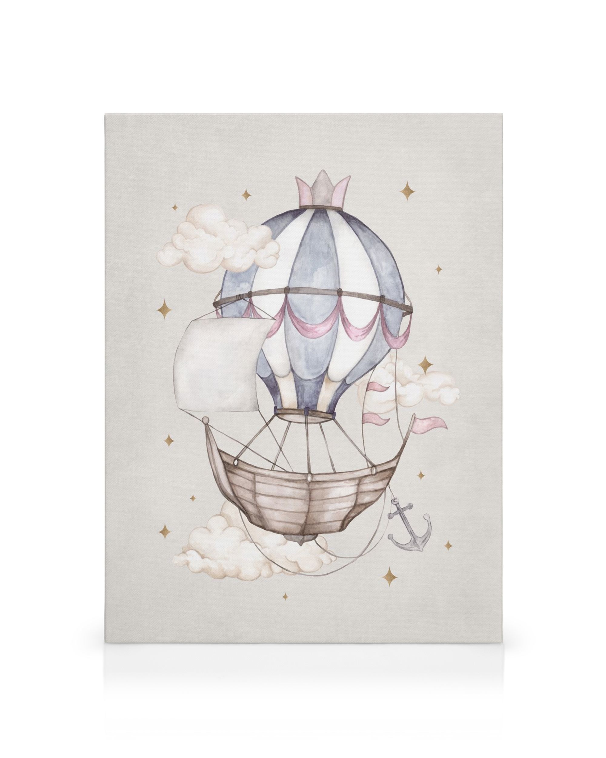 Desde 24,95 €Un lienzo que ilustra un globo aerostático caprichoso con rayas azules y blancas, detalles en rosa y estrellas doradas, flotando en nubes blancas. La cesta del globo es un barco marrón con una vela blanca y banderas rosas. Este adorable arte de pared para la guardería añadirá un toque mágico a la habitación de cualquier niño.