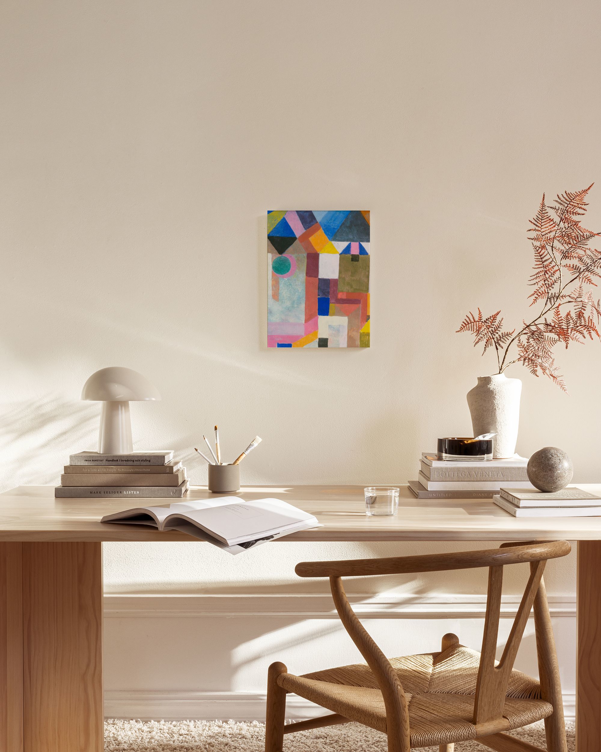 Desde 8,45 €Un vibrante lienzo abstracto con formas geométricas superpuestas en azul, amarillo, rosa, marrón y negro sobre un fondo blanco. La textura rugosa en algunas áreas le da a este llamativo arte mural un aspecto único que animará cualquier espacio.