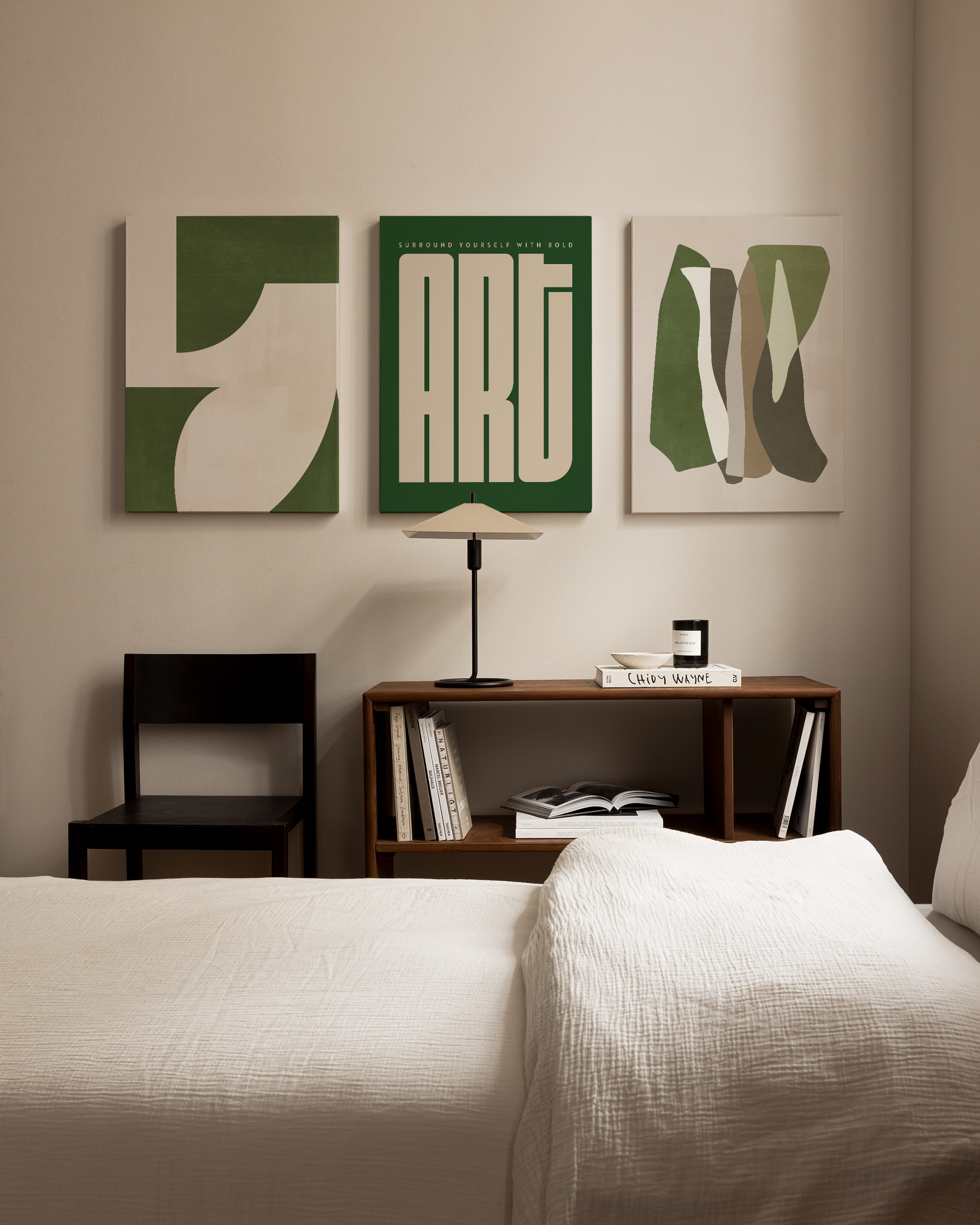Tres lienzos abstractos verdes con formas y letras blancas. Conjunto perfecto de cuadros para tu dormitorio.