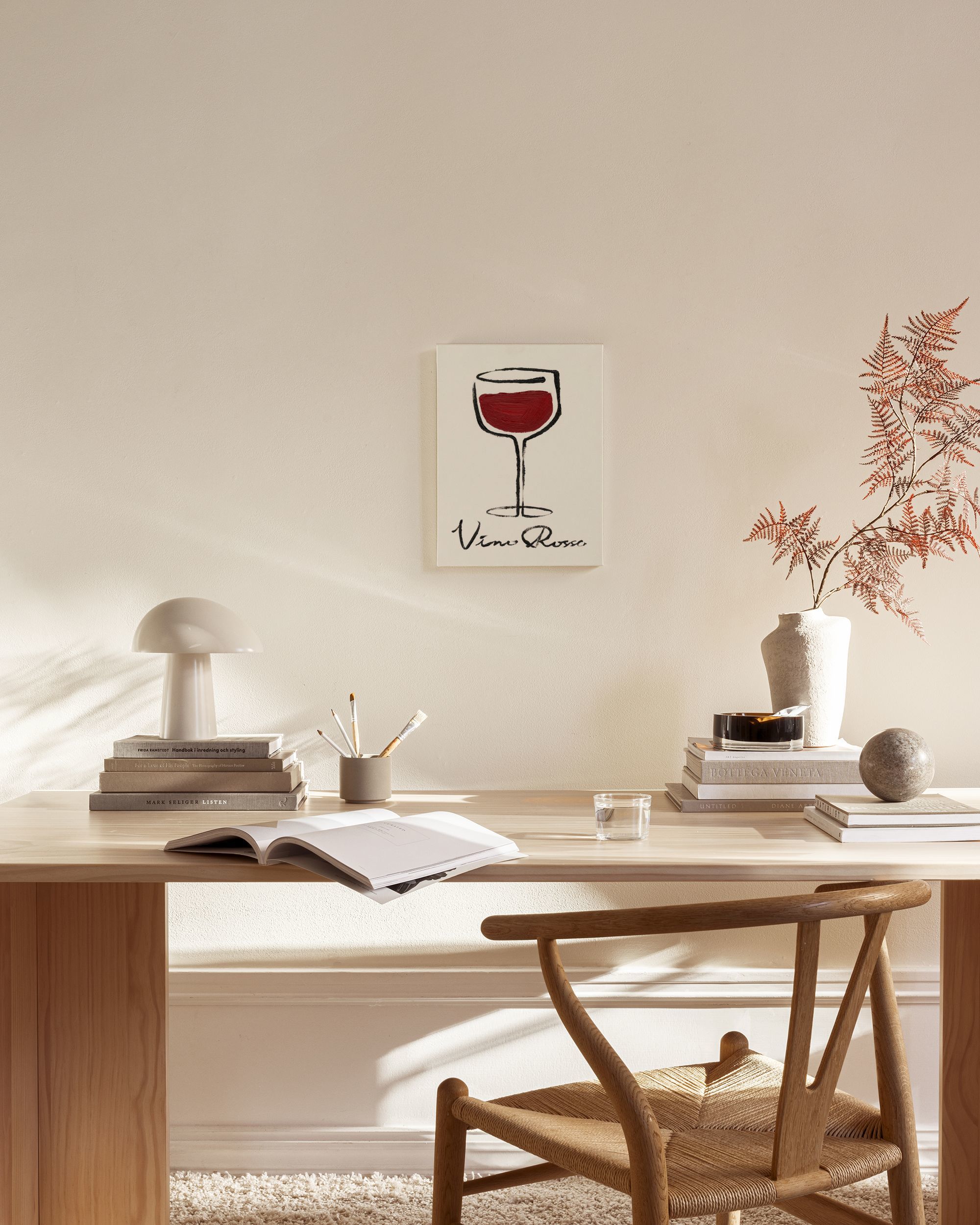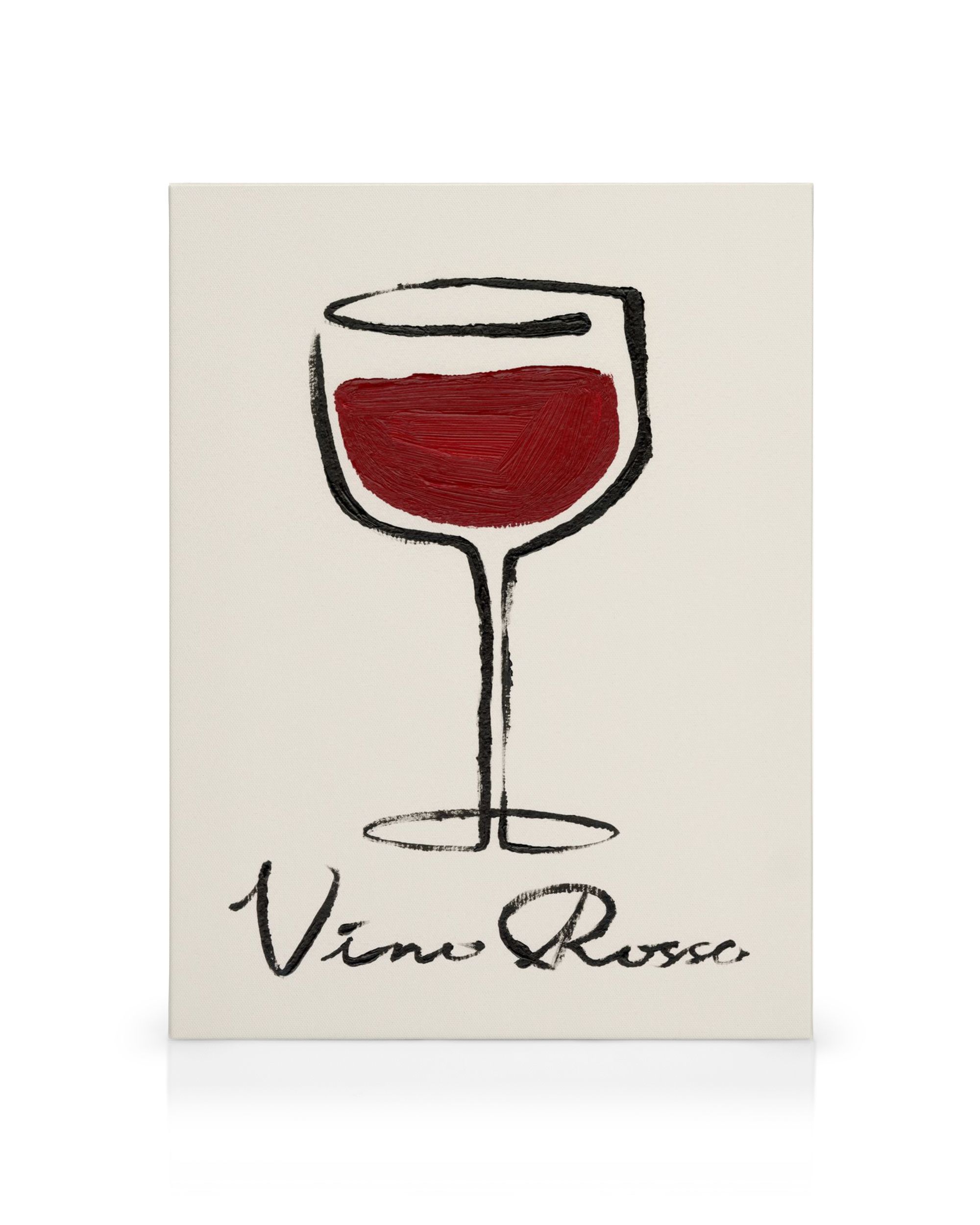 Desde 28,54 €Un lienzo que ilustra una copa de vino tinto, dibujada con un contorno simple y relleno rojo texturizado sobre un fondo beige claro. El texto "Vino Rosso" aparece debajo de la copa. Perfecto para tu pared de galería.