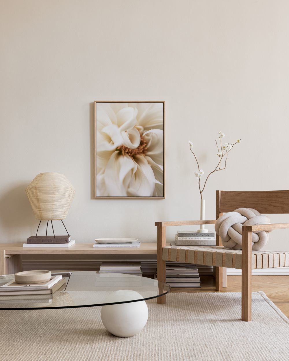Hermoso lienzo de una flor blanca con pétalos suaves contra un fondo beige claro. El arte perfecto para añadir a tu galería de cuadros o decoración del hogar.