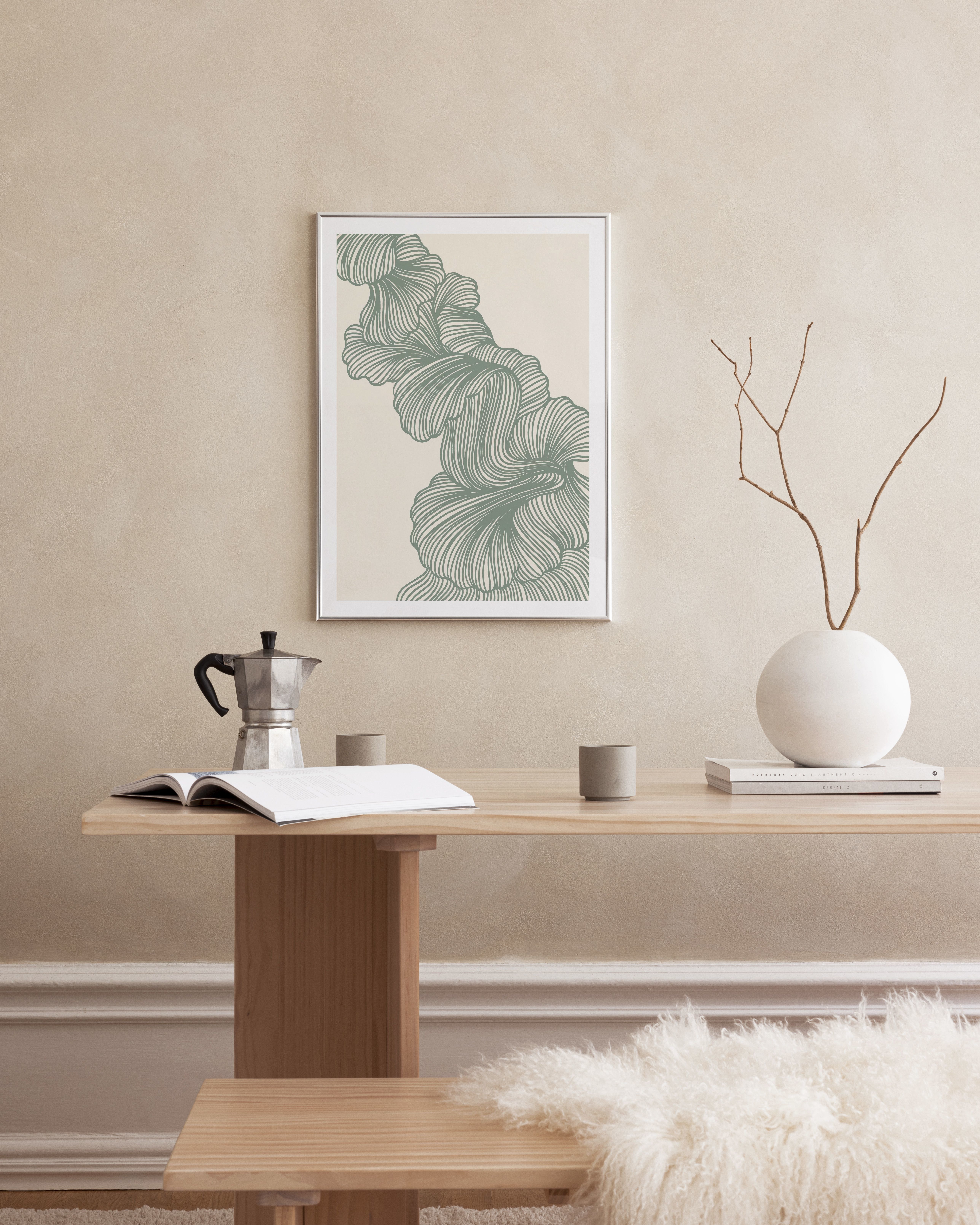 Desde 13,97 €Póster abstracto con líneas verdes curvadas que forman hojas sobre un fondo crema claro. Las líneas fluidas crean movimiento y profundidad.