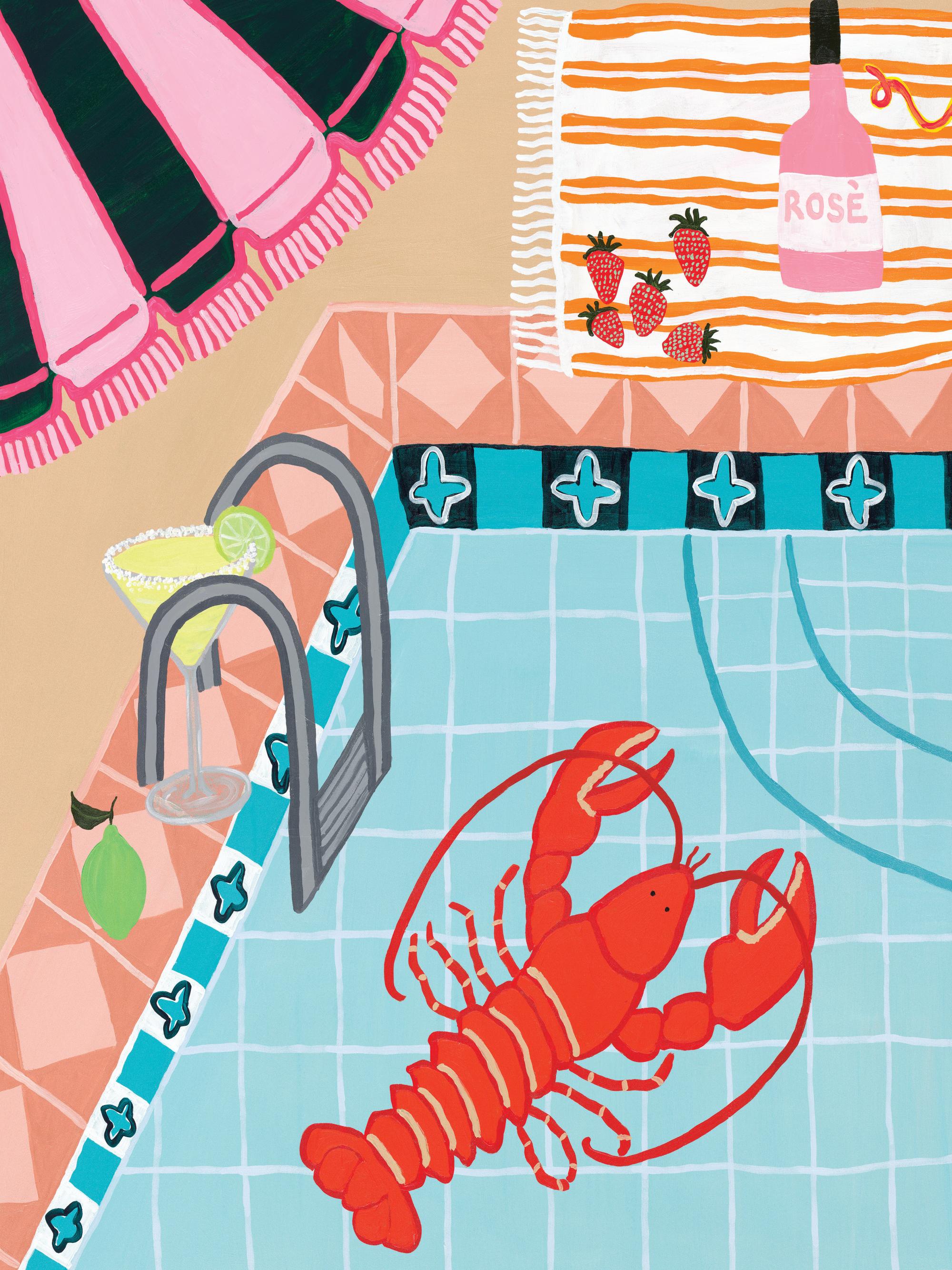 Ilustración de una langosta roja en una piscina, con frutas y bebidas al fondo. ¡Este colorido póster combina a la perfección con «Palm Springs n.° 2»!